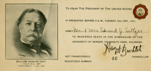 1911: William Howard Taft made the first presidential visit to campus in 1911. Coincidentally, Taft came to DU on Oct. 3—the same date as the upcoming debate. Taft knew Chancellor Henry Buchtel through Republican party politics. Buchtel had served as the governor of Colorado just a few years earlier.