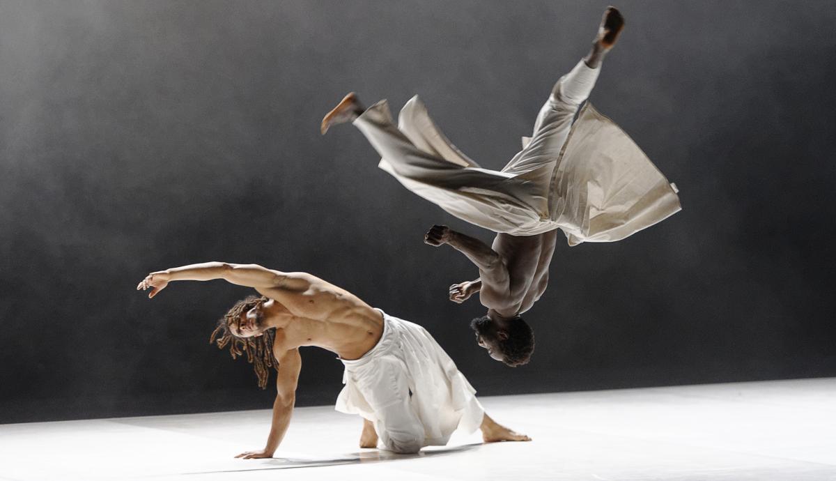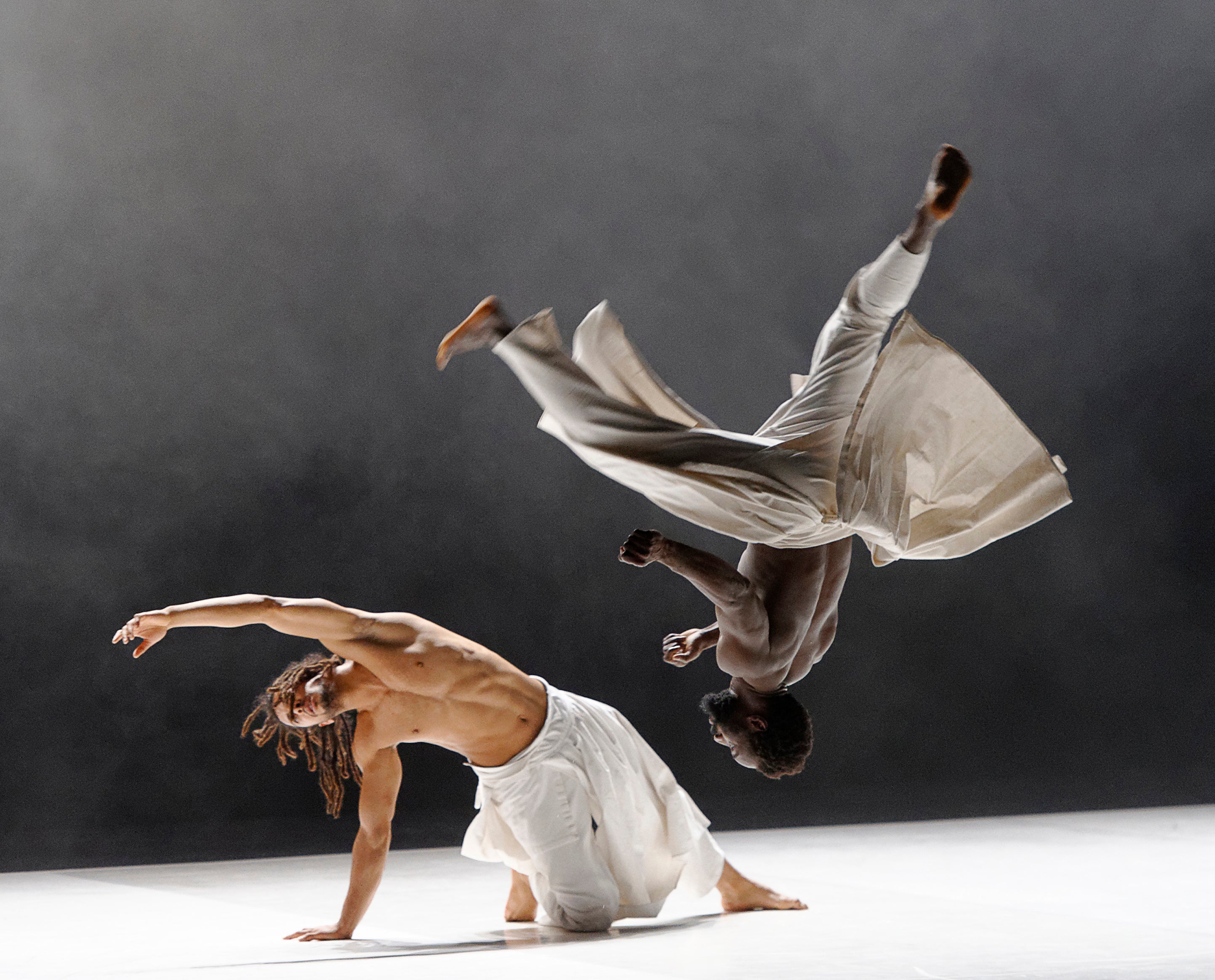 Two dancers from the Compagnie Hervé Koubi performing on stage.