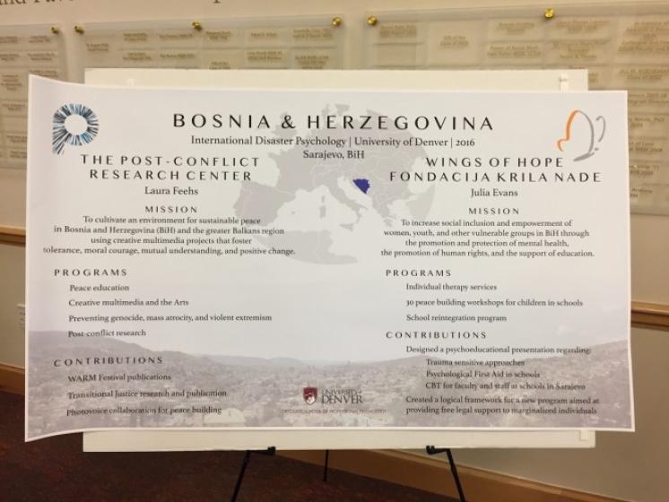In addition to clinical work, some students researched effective methods of dealing with trauma. Laura Feehs interned with the Post-Conflict Research Center in Sarajevo, Bosnia. She looked at how unemployment and inter-ethnic tensions affect youth in post-conflict societies, specifically in the context of the 1995 Srebrenica genocide. “My experience in Bosnia helped me realize how psychology fits into transitional justice,” Feehs said. “As a society coming out of a war, the fact that mental health services weren’t really provided is evident in the way that the last 20 years have unfolded in Bosnia.”