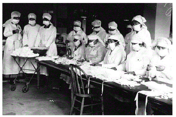 With protective equipment in short supply, Red Cross volunteers in Massachusetts gather to assemble gauze influenza masks destined for Camp Devens outside of Boston.