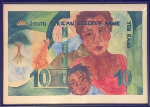 For her final project, Walsh opted to create a work of art that is now on display in Boettcher West in the Department of Geography and the Environment. Using water-soluble pencils, she reproduced the country's currency — the South African rand — with an artistic twist. In particular, Nelson Mandela's face is replaced by a woman and child in a township.