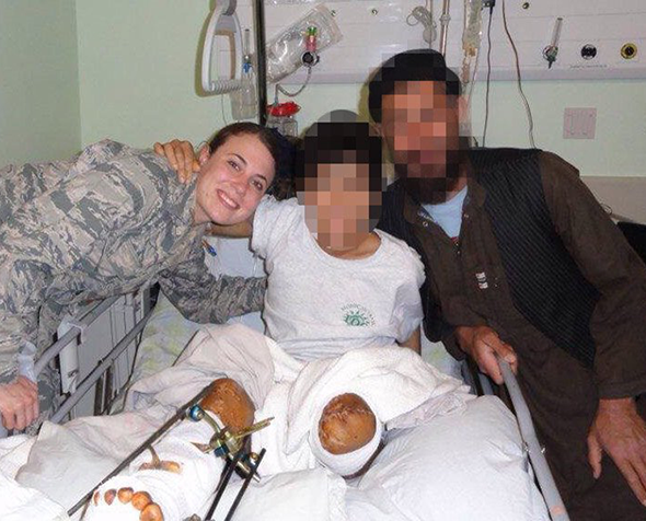 Jen Burch with a boy who had lost his leg after being hit with an improvised explosive device and the boy’s father at a military hospital in Kandahar, Afghanistan.
