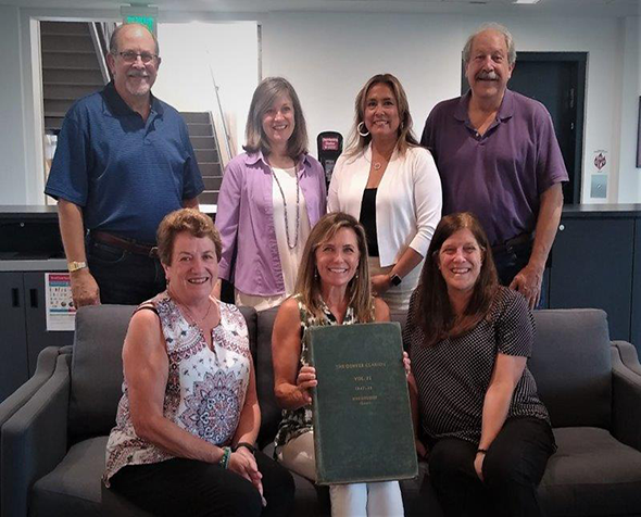 The Steinke family with Prof. Lynn Schofield Clark. In addition to establishing the student scholarship, the family donated a leather-bound volume of 1947 Clarions to the University's archives.