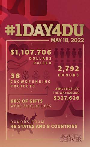 On May 18 during 1Day4DU – DU’s annual day of giving – gifts large and small poured in from across the country in support of our students. With total giving amounts increasing every hour, DU’s alumni, parents, friends, students, faculty and staff invested in our students. They gave to projects making a difference in the student experience and the preparation for successful post-graduation paths, in addition to other priorities across campus.