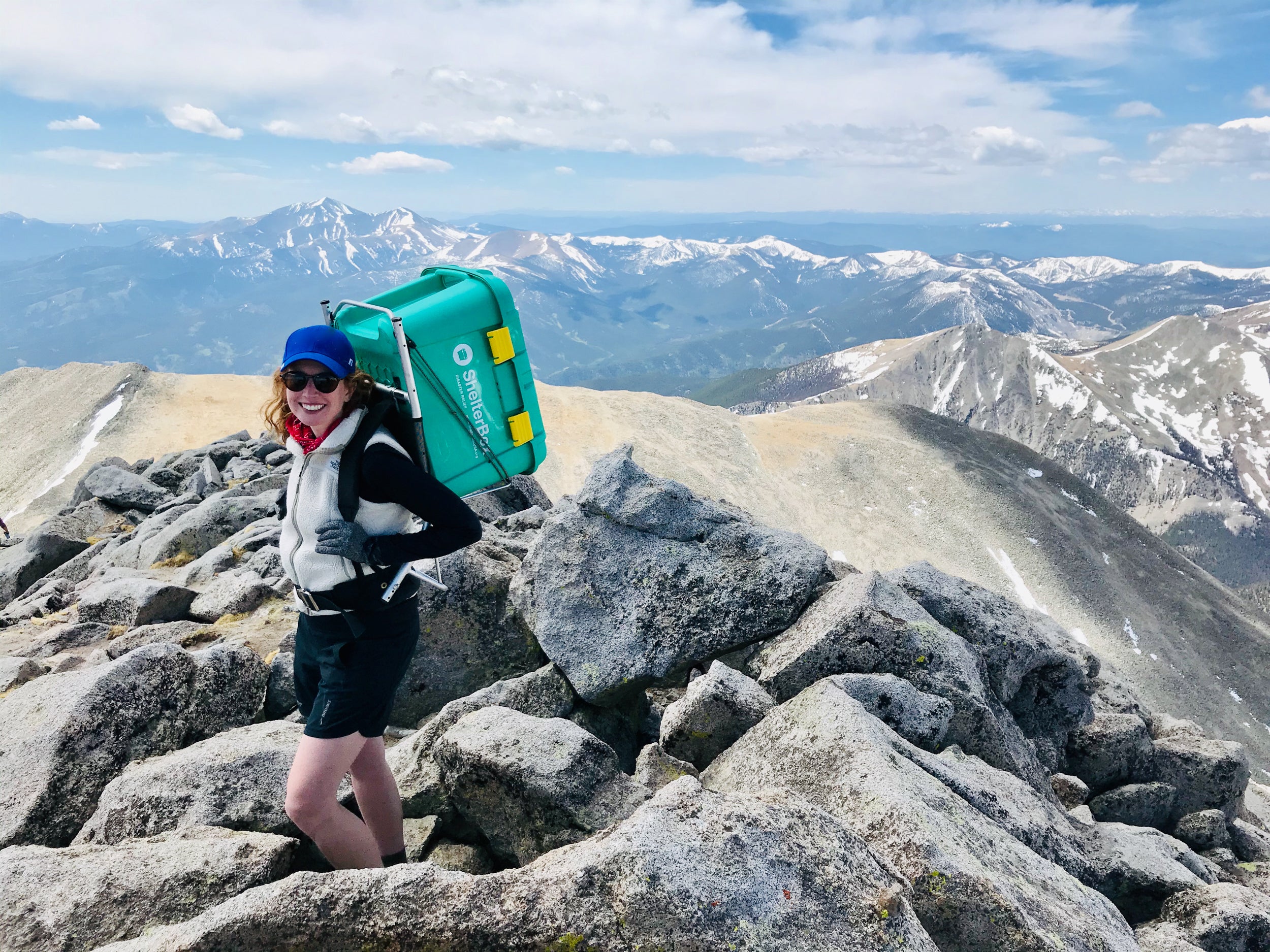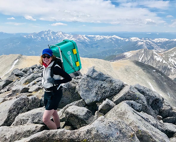 In just two weeks, University of Denver graduate student Brittney “Bert” Woodrum will fill her car with prepared meals, dried fruits, hiking gear and a special green box she mounted to a backpack frame and then head for the hills — or rather, the mountains. She’ll spend the next three months living in her car and waking up with the sun, just in time to begin her summit of all 58 of Colorado’s famed fourteeners (mountain peaks exceeding 14,000 feet in elevation).