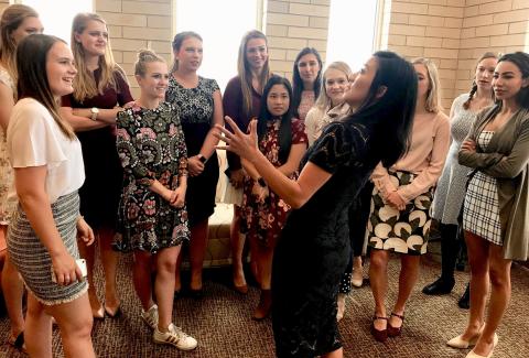 Michelle Kwan (BA '09) speaks with students before her Alumni Weekend lecture. (Photo: Wayne Armstrong)