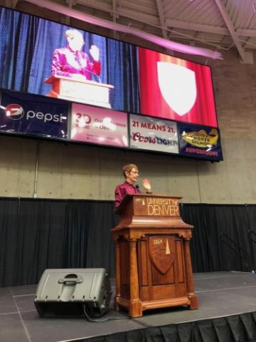 She talked about how the Learning Effectiveness Program and Campus Life and Inclusive Excellence are helping students learn and lead in the 21st century. Chopp discussed how the Joseph and Loretta Law Institute for Arts and Technology is just one way DU is helping to create and expand knowledge that addresses society’s challenges. She highlighted how the Veterans Advocacy Project, the Barton Institute for Philanthropy, the Center for Community Engagement to advance Scholarship & Learning (CCESL), and the Interdisciplinary Research Incubator for the Study of (In)Equity (IRISE) are all partnering with the community to make a difference in Denver and the Rocky Mountain West. Finally, she talked about the success of DU’s student-athletes and coaches in fostering the notion of One DU.