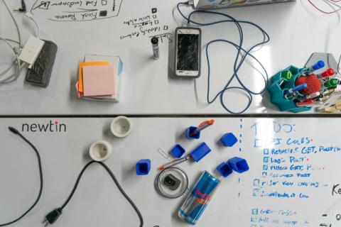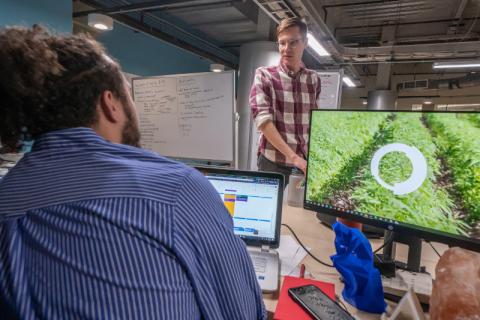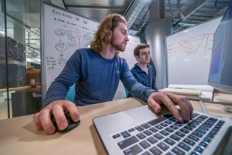 Sequestered deep below the Cable Center, located on the northwest corner of campus, the space is at once barren and chaotic, an industrial warehouse vibe accented by multicolored wires that snake the ceiling. Sticky notes are everywhere, and everything — the walls, cubicle partitions and even the desks — seems to be a dry erase board, scribbled with sketches and notes.