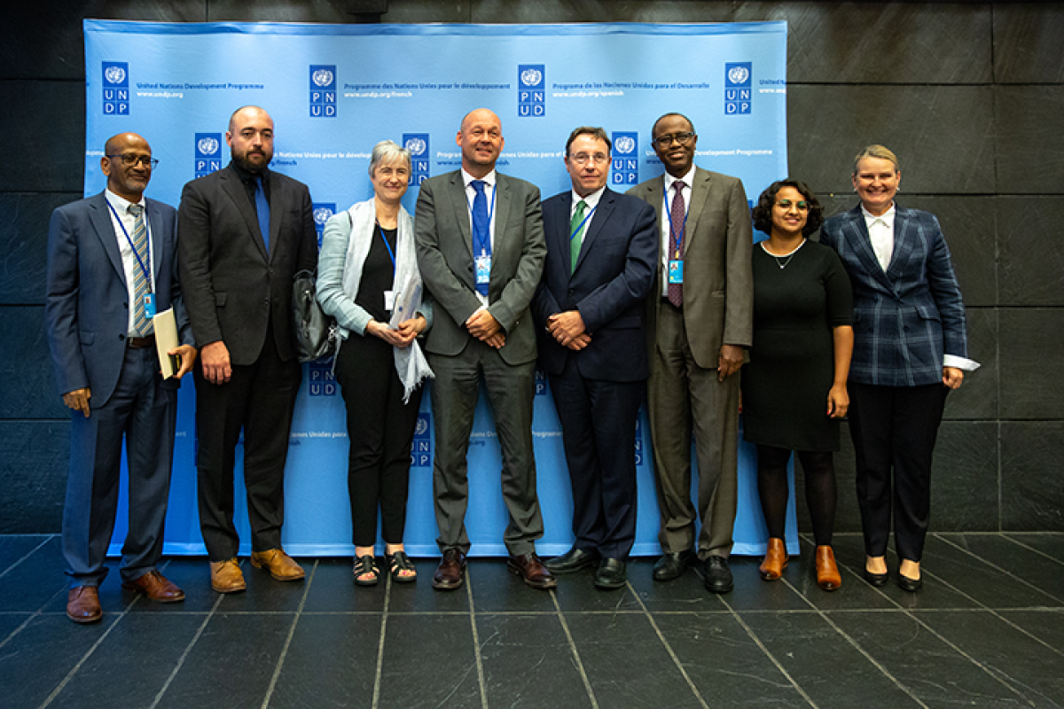 Jonathan Moyer (second from left) delivers the Pardee Center's first report on the conflict in Yemen to various leaders including Achim Steiner, administrator of the United Nations Development Programme.