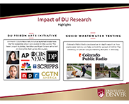 DU’s Public Impact Fellow (PIF) Program continues to help faculty feel more comfortable disseminating their research through a variety of public channels. PIF faculty accounted for more than 11% of all media mentions for the University. Assistant Professor Govind Persad, Sturm College of Law, and Associate Professor Alex Huffman, College of Natural Sciences and Mathematics, were two of the top 10 faculty members to appear in the media this past year and are former Public Impact Fellows.
