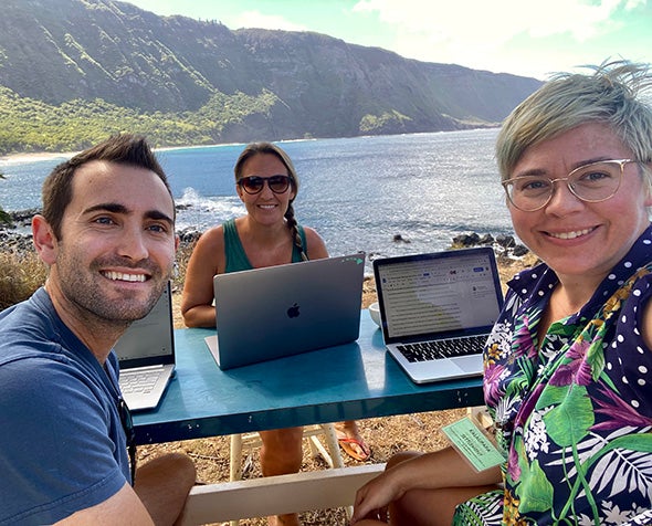 Robin Tinghitella (center) and her fellow researchers pose for a photo while working at a table in Hawaii.