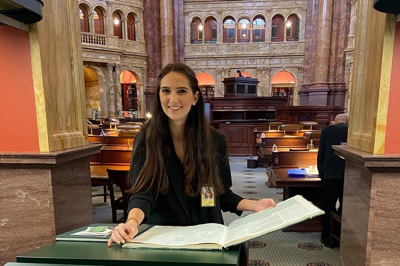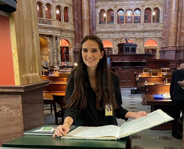 Cheyenne Hunt-Majer conducts research in the Library of Congress during the January impeachment procedures against President Donald Trump.