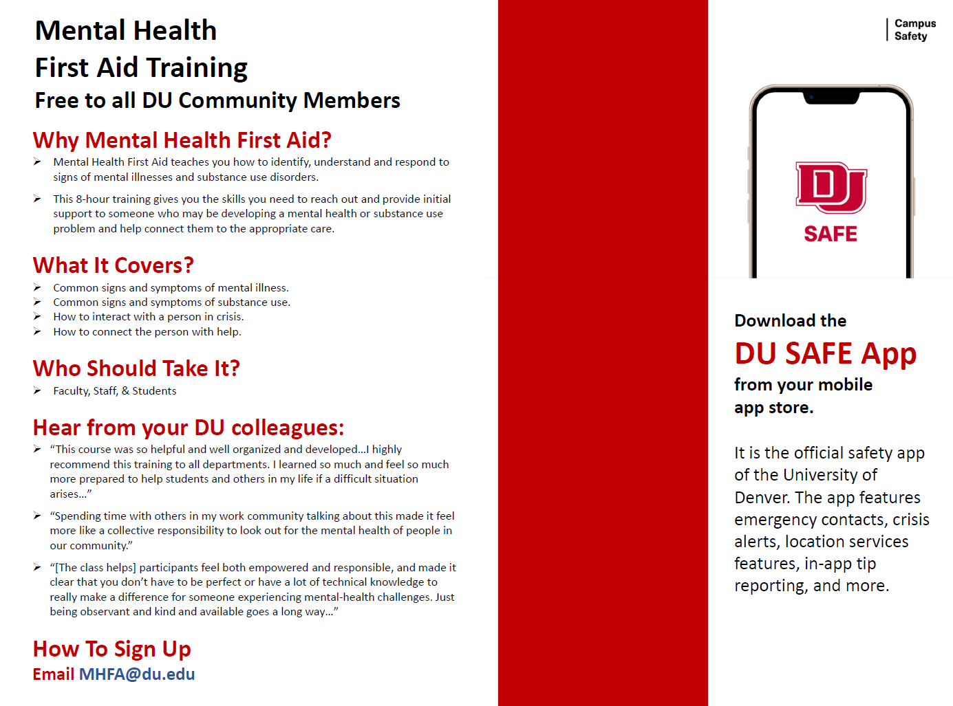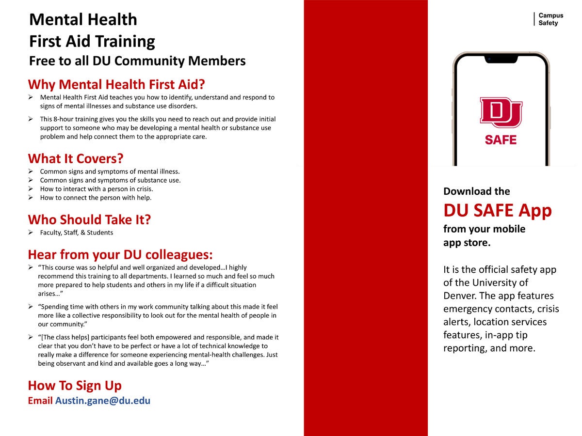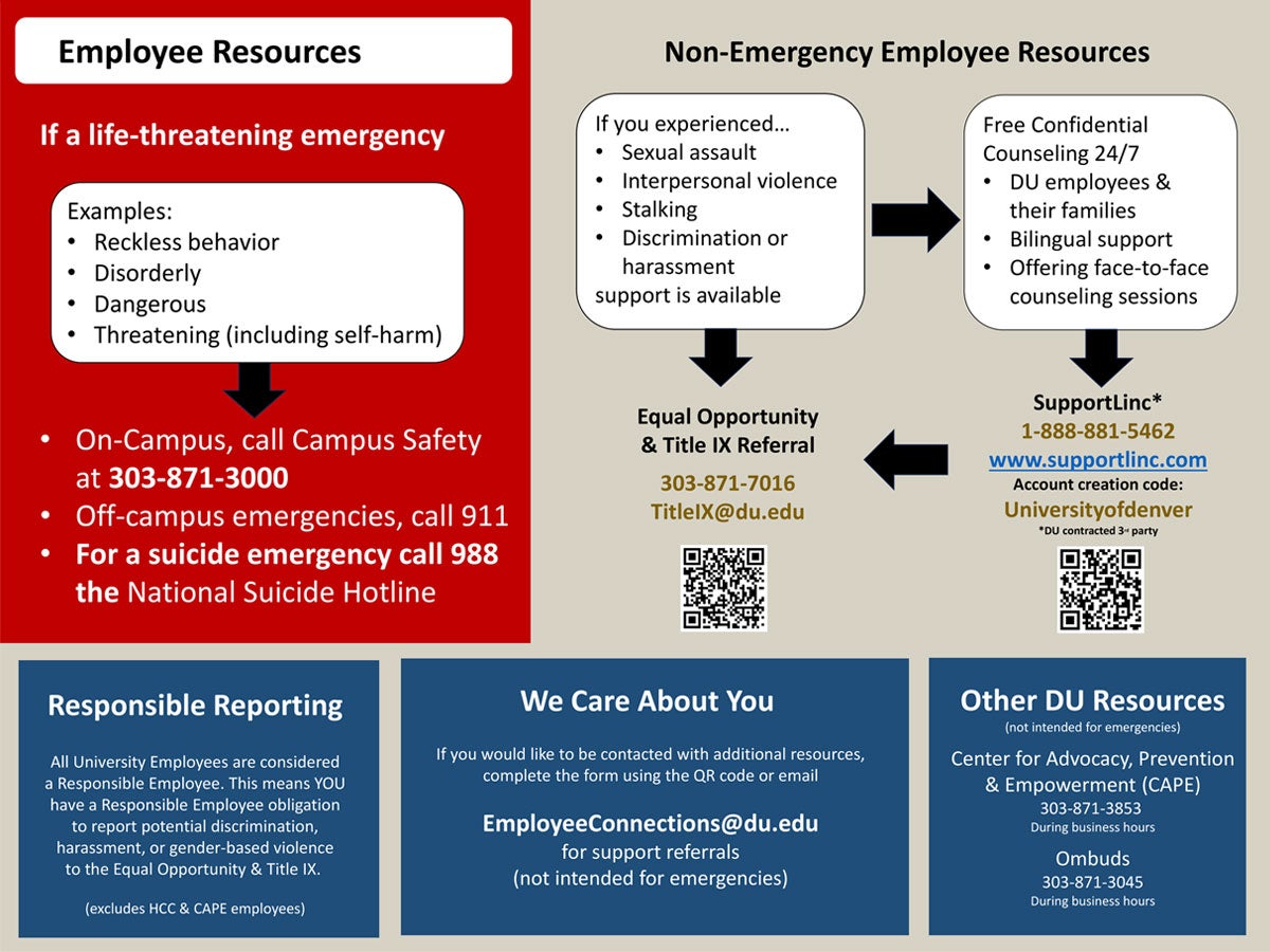 DU cares about you! We have many resources for those employees seeking help and for those who are supporting people experiencing a mental health challenge. For non-emergency information, please email employeeconnections@du.edu and someone from DU will reach out to you on the next business day to guide you through the resources available to you or the employee you're concerned about. The placard below also lists DU resources and below that are local resources.