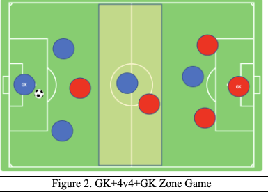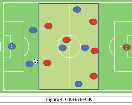 In Figure 4 we present a GK+6v6+GK game, again a similar game to that of Wednesday and Thursday but now adapt some dynamics of the game and the spacing of the middle zone to emphasize some of the micro principles in larger spaces and numbers (i.e., meso-scale relationships).