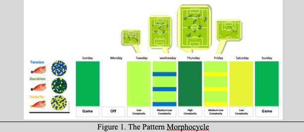 Building upon the priorities above, as an example, on Wednesday we aim to achieve a low to moderate complexity to promote the muscular contraction of tension to execute the micro principles of the ball progression game principle. The tension of muscular contraction (i.e., represented with the blue color in the pattern morphocycle schematic) can be conceptualized as the body’s mechanism to start and go or elude obstacles in fluidity. When thinking about the demands of football we can quickly recognize the importance for players to emphasize the tension of contraction as many actions involve stop-and-go (i.e., jumping to head the ball, 1v1 accelerations, change in direction while defending, etc.).