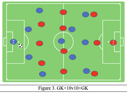 In Figure 3 we see a GK+10v10+GK training activity that is very similar to the game on Wednesday but now produced at a macro scale, involving higher complexity as more space and number of players are involved.