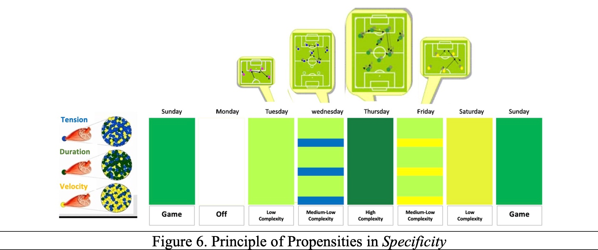 The main premise of the complex progression principle is that it helps organize the training week in relation to levels of complexity. Essentially, coaches will target variations of complexity (e.g., high, medium, or low / macro, meso, and micro) for each training day dependent on the readiness of the player to acquire the game idea; essentially it is gauging whether they are sufficiently recovered from the previous game day to acquire understanding of the game idea in large dosages or smaller dosages
