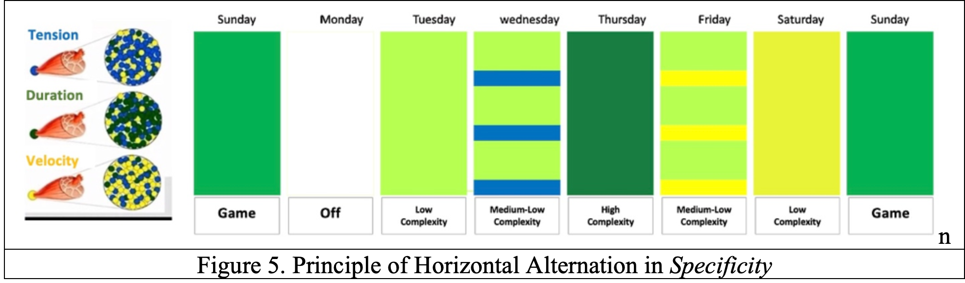 Horizontal alternation in Specificity safeguards the performance-to-recovery relationship of the player and teams by distributing different scales of the “intended play” throughout the week. The methodology identifies three different but interconnected types of muscular contractions: tension (i.e., eccentric contractions, the “braking and accelerating” moments of playing), duration (i.e., the eccentric and concentric contractions occurring over long periods of playing) and velocity (i.e., concentric contractions, the sprinting moments that occur in great speeds). Although we know that during any exercise, muscular contraction expresses these three characteristics jointly, we can, by manipulating the exercises, give dominance to one over the others.
