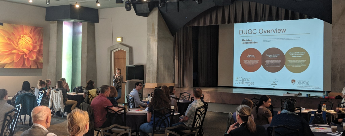 At DU we believe that “sustainability” means working together to create a world where ecosystems and societies can thrive. DU Grand Challenges (DUGC) recognizes that communities thrive when each of has what we need to fully live, work, and participate in the social fabric that holds us all together. DUGC brings faculty, staff, students and regional community leaders together to advance this vision through community-university conversations and partnerships for the public good.
